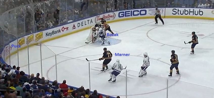 Despite being boxed out by Sabres center Zemgus Girgensons, Bozak was able to tap the puck away and towards the far corner, an area to which Marner had a clear lane.