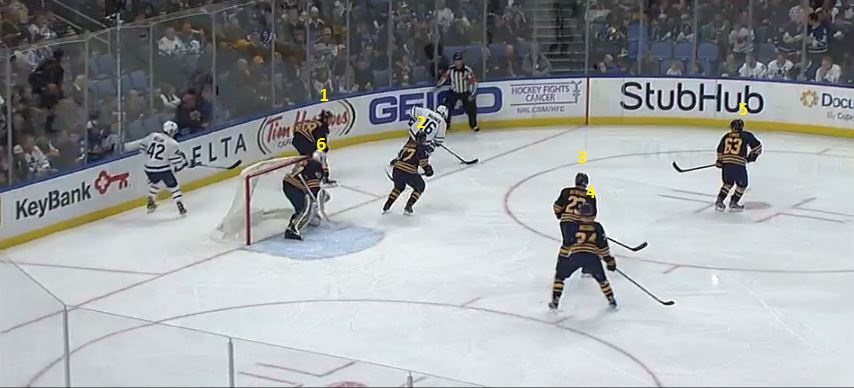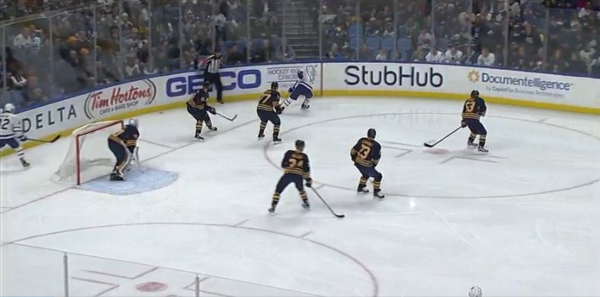 Marner slid into the corner to scoop the loose puck, commanding the attention of all six Sabres on the ice.