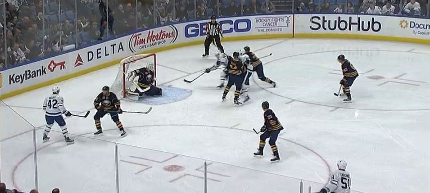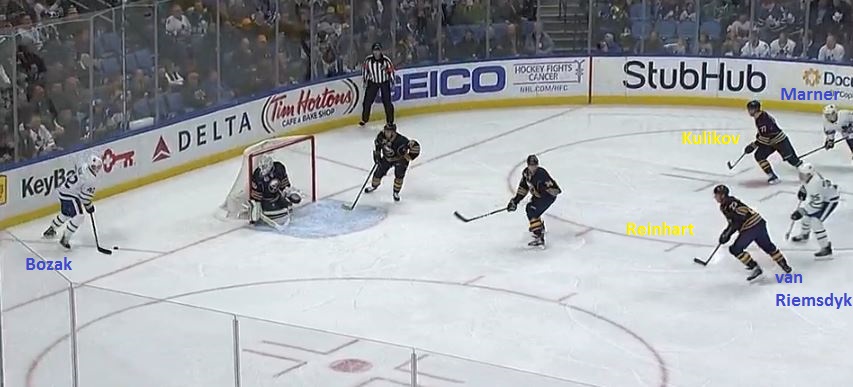 Bozak received Marner's pass, and positioned himself to either take a shot at a heavily-guarded short side or dish the puck to one of van Riemsdyk or Marner, both of whose paths to the net were impeded by Sam Reinhart (23) and Dmitry Kulikov (77).