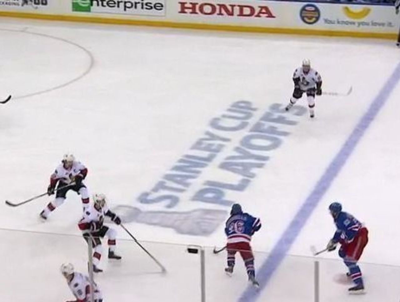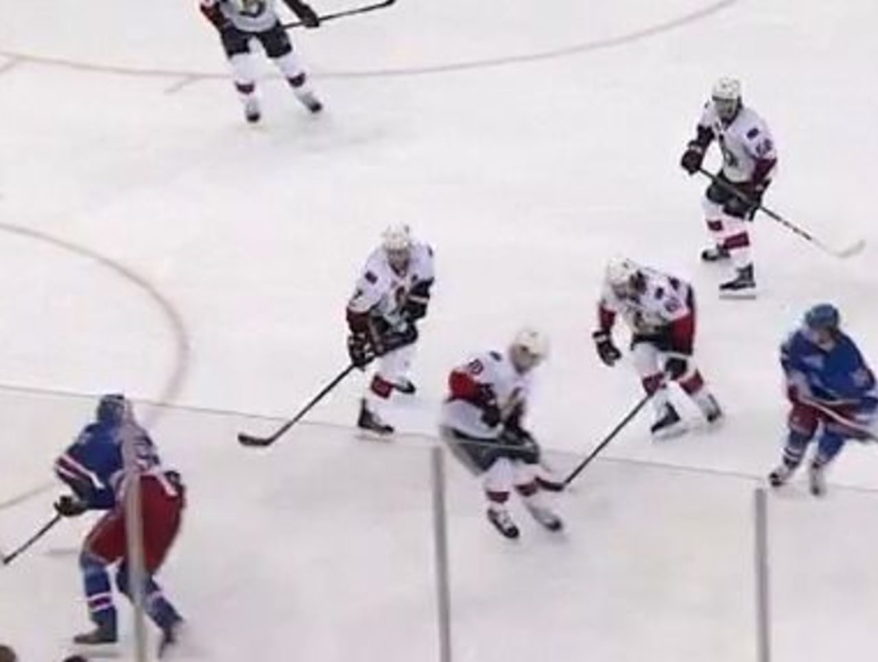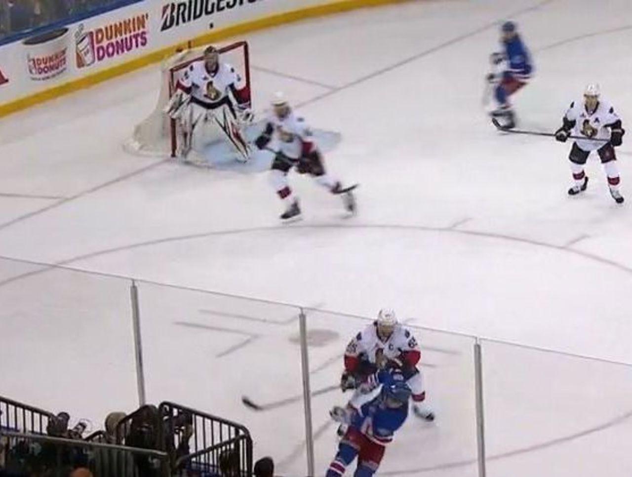 With all four Senators defenders converged on No. 36 (not ideal positioning), Zuccarello somehow feathered a perfect pass through to a streaking Zibanejad.