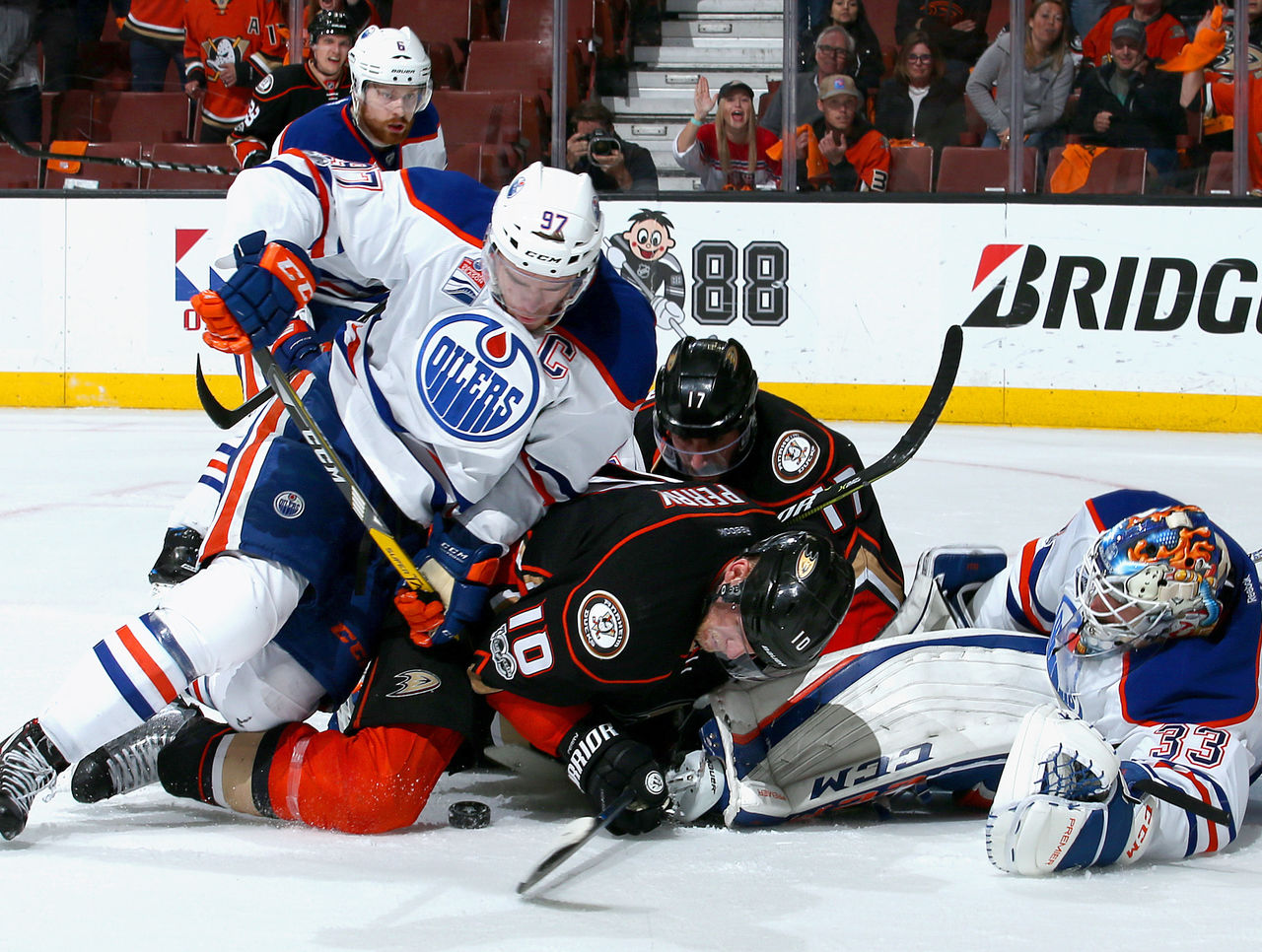 Talbot has to be given the freedom to make a save attempt on the play. Perry's bump totally disregards that and throws the goaltender off. Edmonton is up 2-0 at the time and it completely changes the momentum as Anaheim went on to win the game.