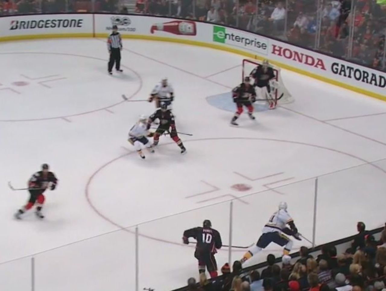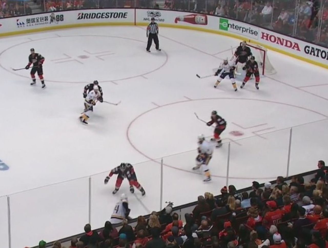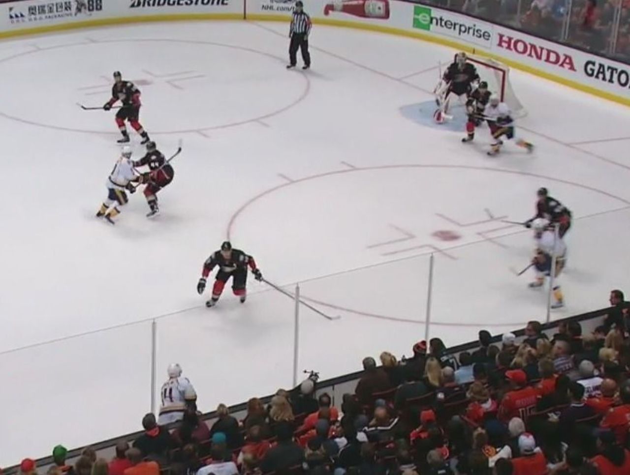 He cuts toward the goal as a pair of Ducks (Nate Thompson and Cam Fowler) stand ready to meet him, with Perry trailing Ekholm in hot pursuit.