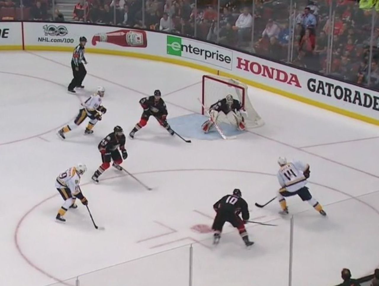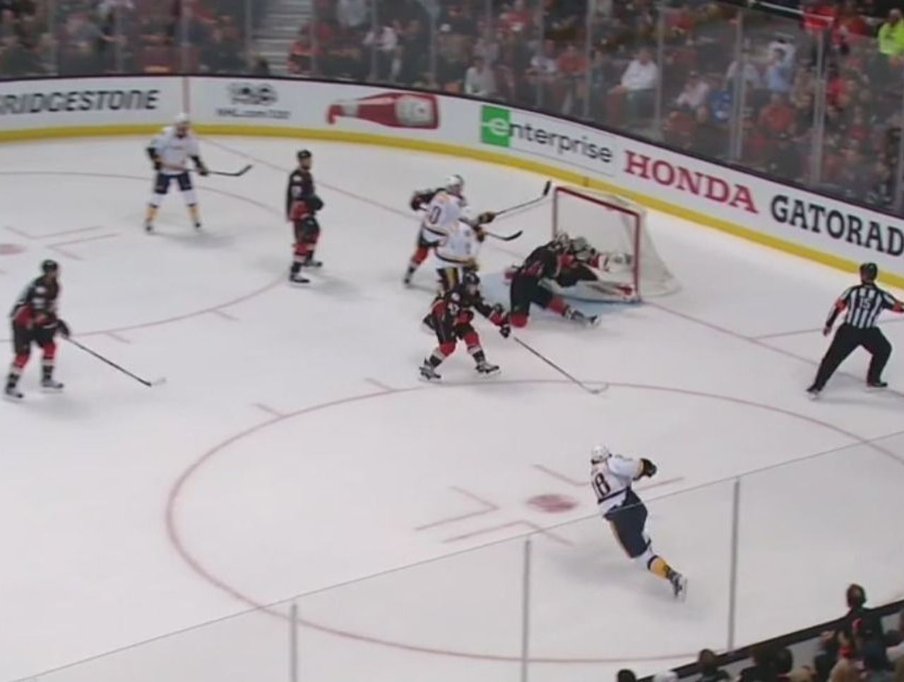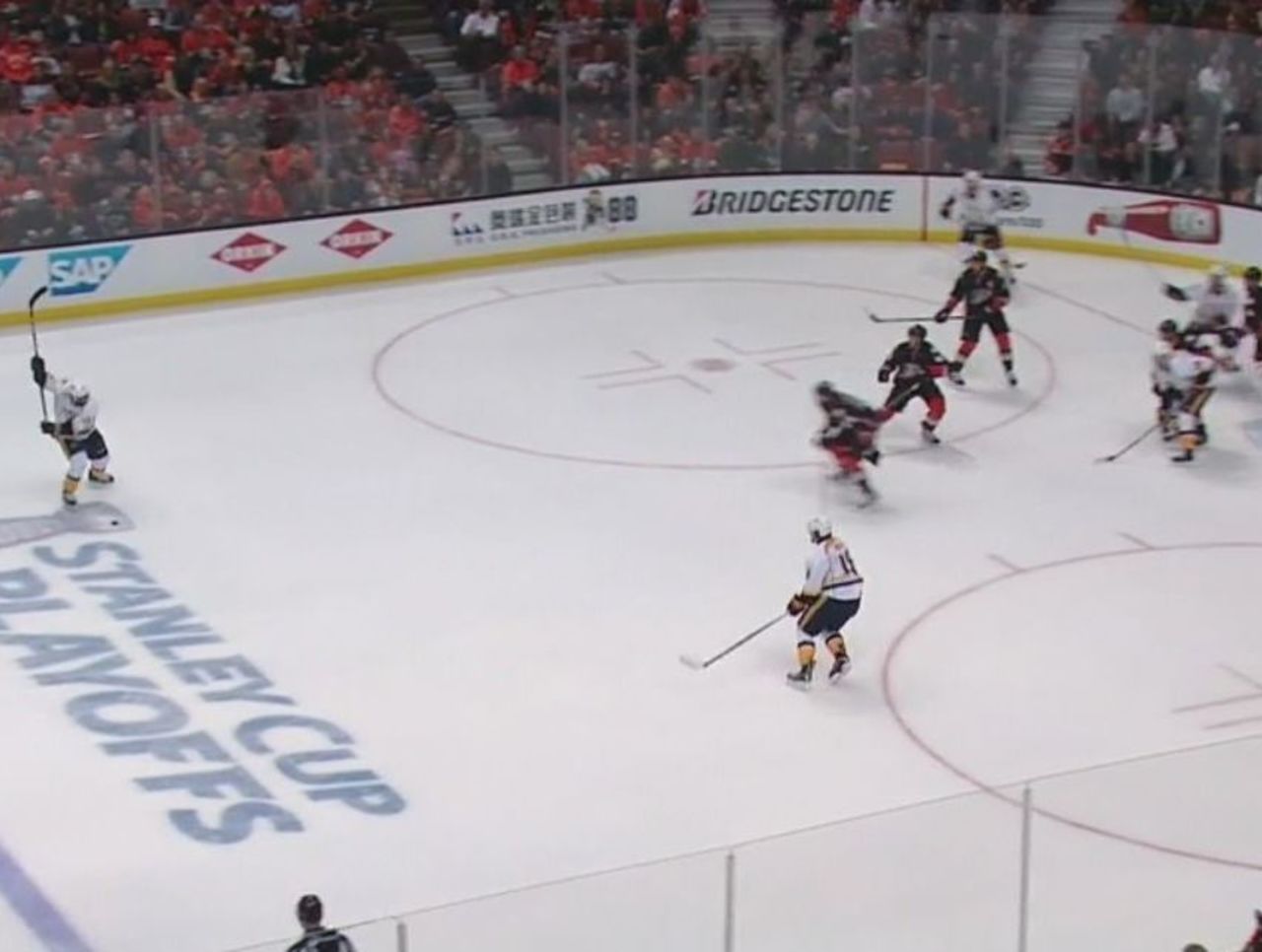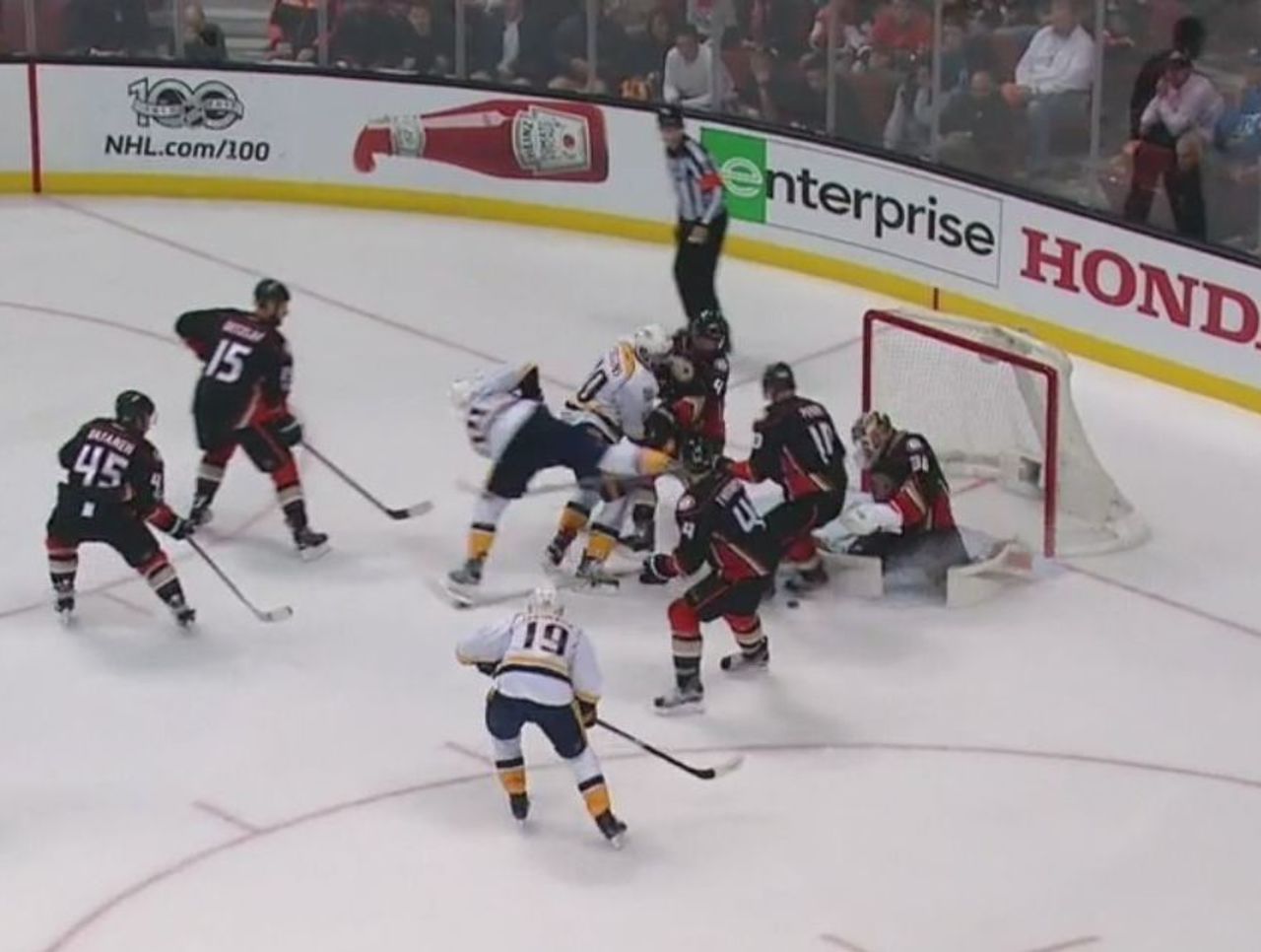 He cuts toward the goal as a pair of Ducks (Nate Thompson and Cam Fowler) stand ready to meet him, with Perry trailing Ekholm in hot pursuit.