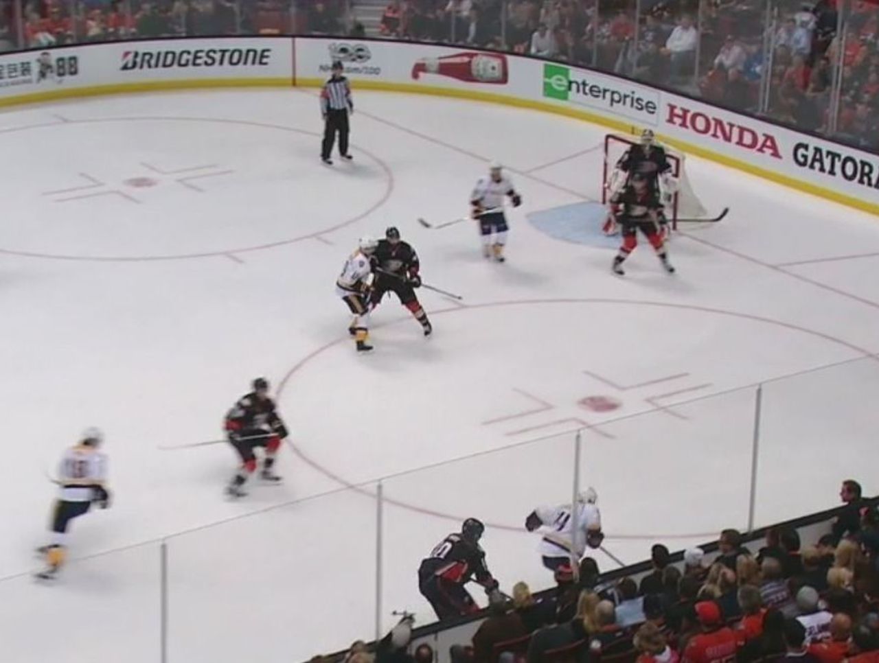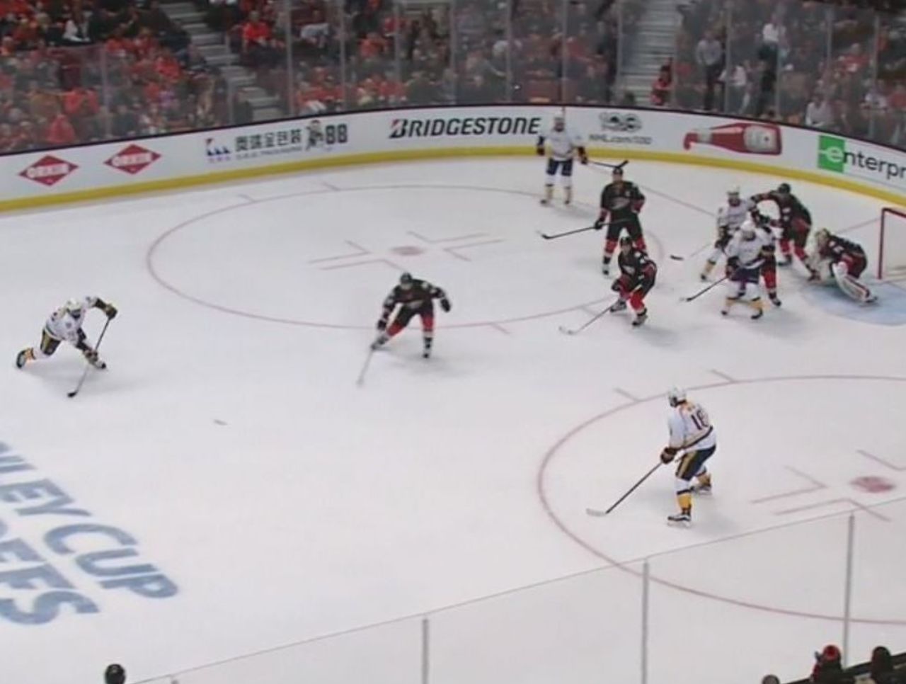 We begin with Ekholm (No. 14 in white) controlling the puck along the boards after taking a pass from Neal.