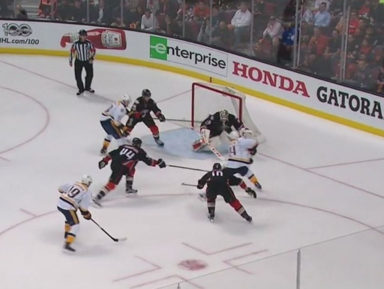 He gets a shot off, but it's denied by goaltender John Gibson and the slew of bodies in front of him.