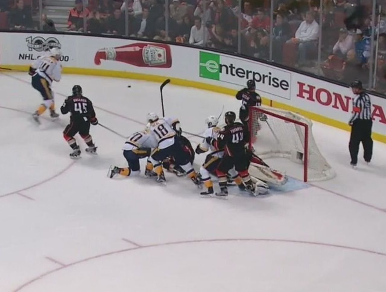 A mad scramble ensues and the puck trickles into the corner, but Ekholm stays with it and regains possession.