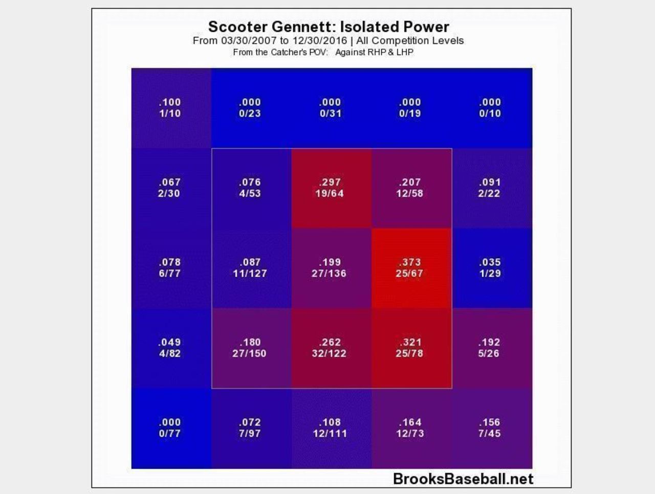 Omitting the current season, Gennett's zone profile indicates he generates most of his isolated power from inside pitches, both belt-high and low. Truthfully, though, he does well against anything in the heart of the zone or nearer to him - even down and in outside of the zone.