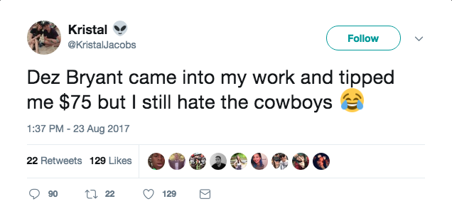 The employee tweeted about receiving a $75 tip from the Cowboys wide receiver, but noted that she still hates the team.
