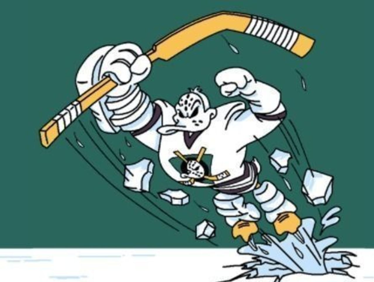 For one magical season in the mid-1990s, the above image actually appeared on Mighty Ducks jerseys. There's just so much to love about this logo. Our favorite part is the Michelin Man-style leg pads.