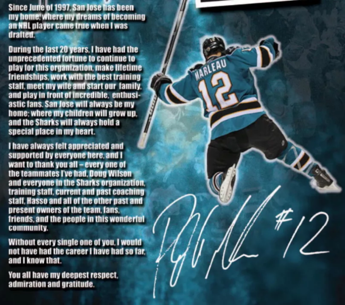 The former San Jose Sharks forward took out a full-page ad in Bay Area News Group publications Sunday to thank the city of San Jose, which he called home for 19 seasons before signing with the Toronto Maple Leafs this summer.