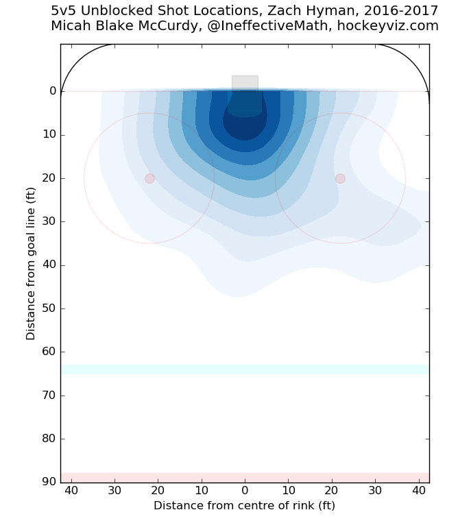 As you can see, the majority of Hyman's five-on-five shots come from within the goalmouth and slot. Alongside two high-volume shooters in Matthews and Nylander, Hyman should see plenty of opportunities to bang in loose pucks and convert chances close to the goal, ultimately boosting his offensive value.