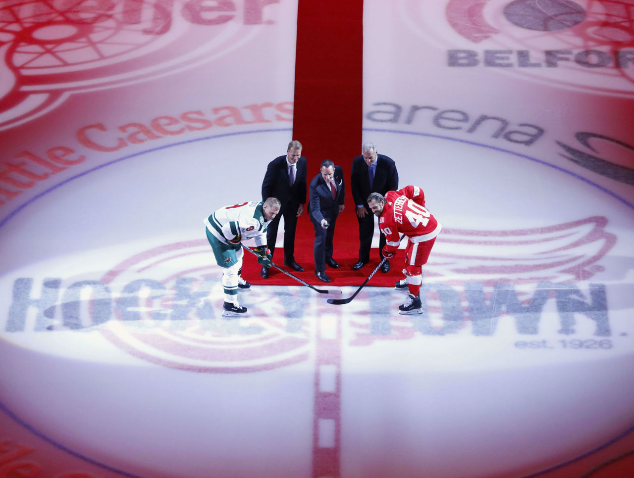 Henrik Zetterberg and Mikko Koivu participated in the ceremonial puck drop by Red Wings President Christopher Ilitch, former captain Nicklas Lidstrom, and TV announcer Mickey Redmond.