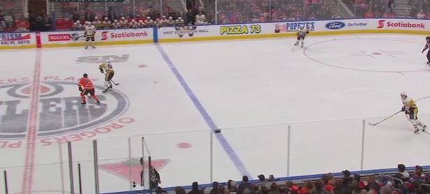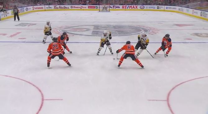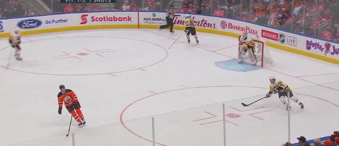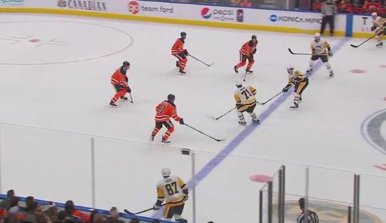 As it became clear that Kessel was going to carry the puck into the zone rather than dump it in deep, the Oilers' penalty killers descended on him and Malkin. On the ice at the time were defensemen Adam Larsson (6) and Darnell Nurse (25), as well as forwards Matt Kassian (44) and Drake Caggiula (91).