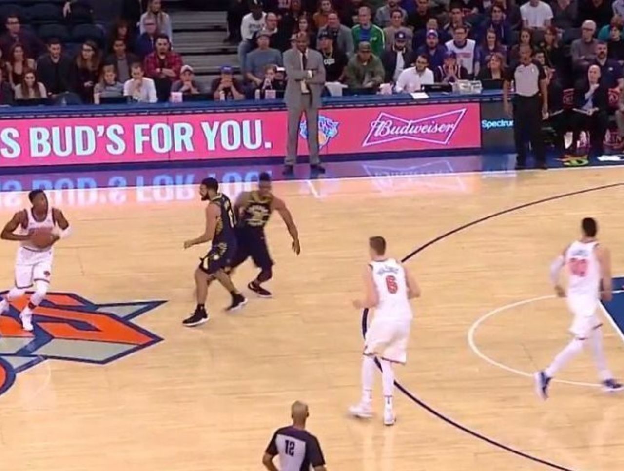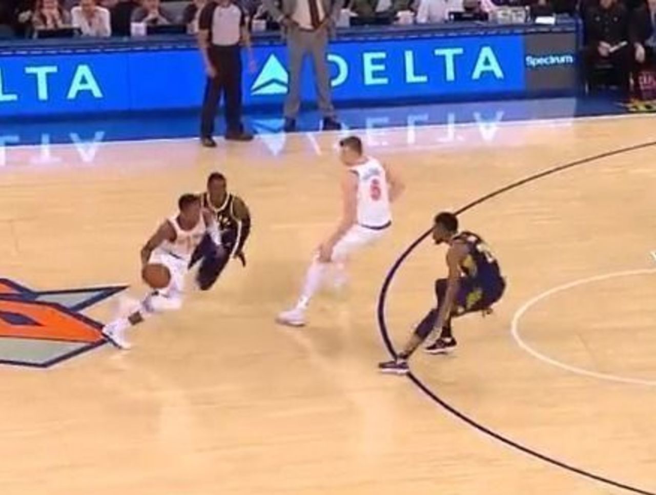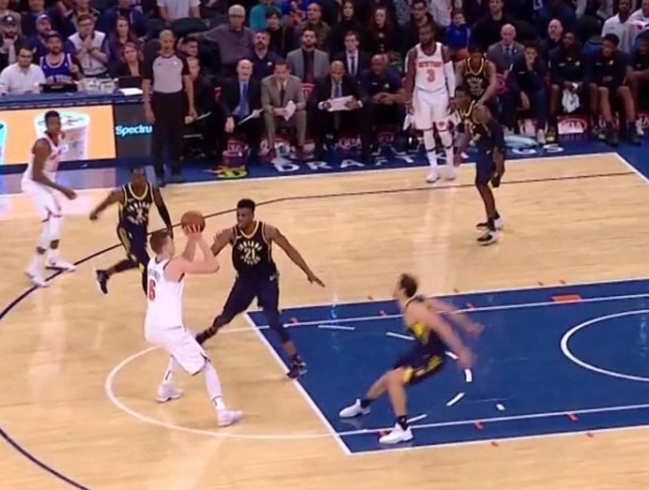 It started at the defensive end. During that span, Ntilikina had two steals and three deflections, hounded Cory Joseph and Victor Oladipo into contested long twos, neutralized Myles Turner and Domantas Sabonis on switches, and made a herculean closeout to contest a Bojan Bogdanovic corner three. In that same period, Porzingis tracked Joseph on a switch and swatted his layup attempt from behind, stoned Oladipo at the rim, torpedoed a Sabonis-Thaddeus Young dribble handoff, and slid over from the weak side on an Oladipo-Sabonis pick-and-roll to draw a charge.