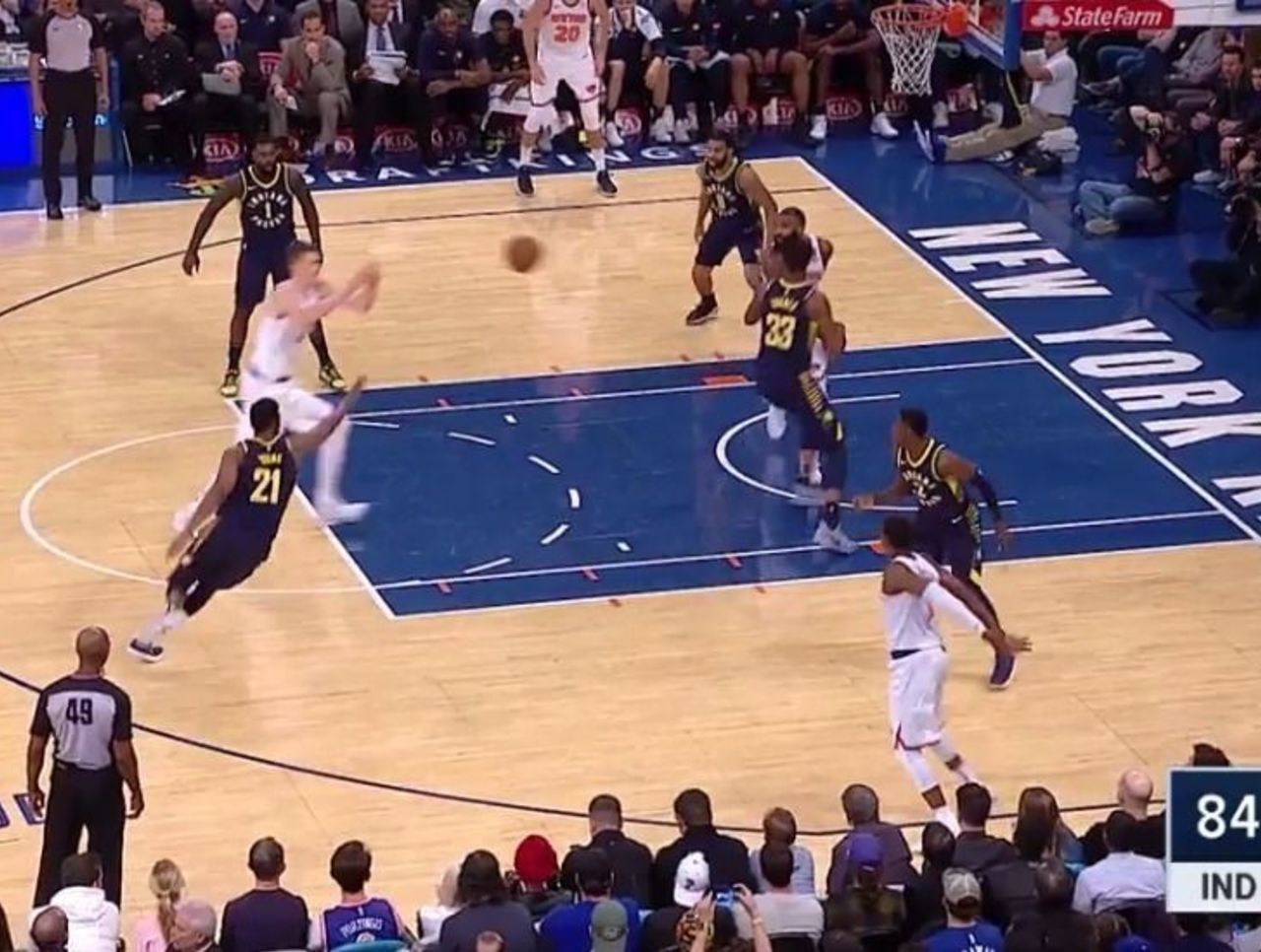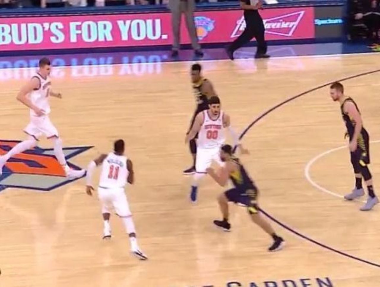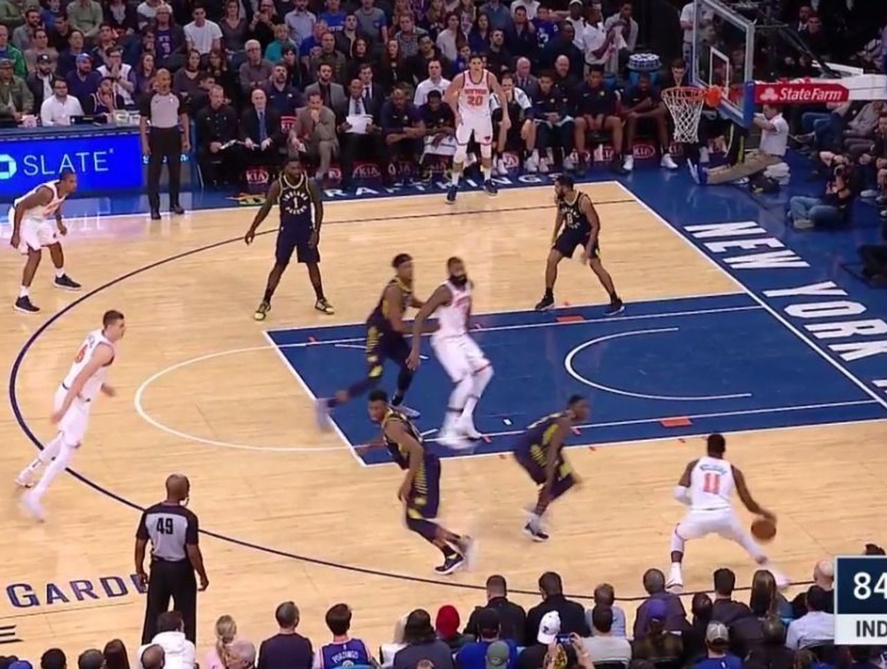 It started at the defensive end. During that span, Ntilikina had two steals and three deflections, hounded Cory Joseph and Victor Oladipo into contested long twos, neutralized Myles Turner and Domantas Sabonis on switches, and made a herculean closeout to contest a Bojan Bogdanovic corner three. In that same period, Porzingis tracked Joseph on a switch and swatted his layup attempt from behind, stoned Oladipo at the rim, torpedoed a Sabonis-Thaddeus Young dribble handoff, and slid over from the weak side on an Oladipo-Sabonis pick-and-roll to draw a charge.