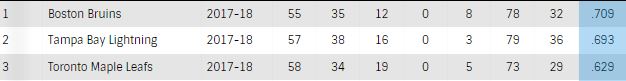 After Tampa Bay's loss to Buffalo and Boston's win over Calgary, the Bruins now trail the Lightning by only a point, but are actually ahead by winning percentage.