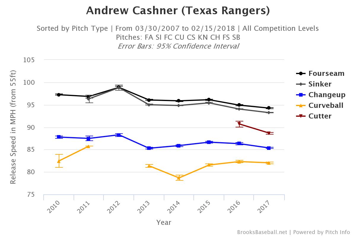 Last year, following a miserable 2016 campaign split between the San Diego Padres and Miami Marlins, Cashner enjoyed a solid season with the Texas Rangers, crafting a 3.40 ERA (138 ERA+) with a 1.32 WHIP over 28 starts. His peripheral numbers, however, weren't nearly as impressive - Cashner's strikeout rate (12.2 percent) ranked dead last among qualified American League starters, contributing to his league-worst 5.30 xFIP - while his velocity dipped for a second straight season, too.