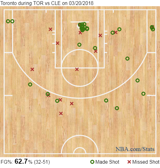 On Wednesday, the Raptors converted 32-of-51 from the field (62 percent), 3-of-5 from the charity stripe, and a scorching 12-of-18 from behind the arc. Their 12 3-pointers also tied a franchise record for a first half, equaling a mark set against the Philadelphia 76ers on March 13, 2005.
