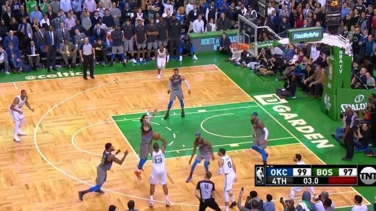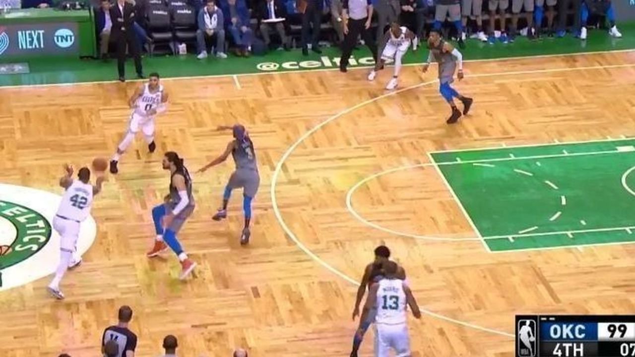 Out of the timeout, Horford sprung Jayson Tatum with a screen that forced Steven Adams to switch out onto the perimeter. With a mandate to take away the 3-point line, Adams crowded Tatum, and basically allowed the rookie to waltz past him into the paint. Three Thunder players awaited him there, but only Corey Brewer offered a good-faith contest, and Tatum made a nice mid-air adjustment to finish the layup and slice the deficit to four. But that was still a perfectly acceptable outcome for the Thunder, since the play took seven seconds off the clock, and they avoided fouling, retaining a two-possession lead. It was then that everything went sideways.