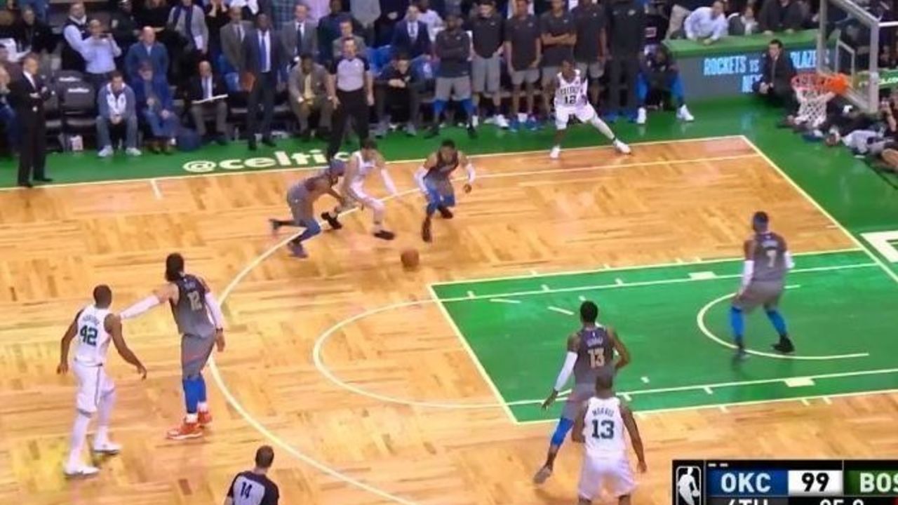 They inbounded the ball to Westbrook, and he was immediately fouled and sent to the line. He clanked the first free throw, but made the second to push the lead back up to five. The Celtics had a timeout left, but opted not to use it. Terry Rozier picked up the inbounds at his own 3-point line, dribbled to the Thunder's, pulled up, and splashed a triple in Westbrook's eye. The whole play took 4.5 seconds. Two-point game.