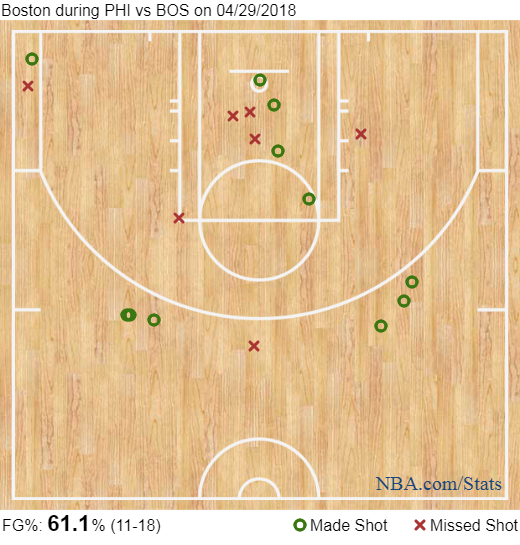 Philadelphia's greatest defensive strength is having Embiid as a gigantic deterrent at the rim. The Celtics used Horford to pull Embiid away from the basket, but for the most part, they didn't bother challenging him - instead driving to pass (knowing the Sixers would cheat and leave someone open) and relying on their perimeter ball movement to break Philly down. That's how Boston dominated offensively while attempting just 19 shots in the restricted area. - Wolfond