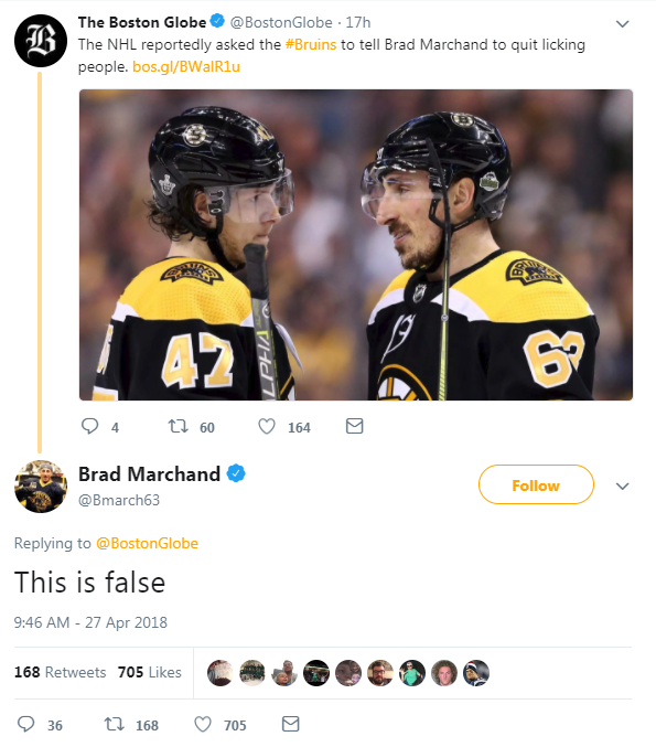 There doesn't appear to be anything tongue-in-cheek about Brad Marchand's response to reports that he was asked to stop licking opposing players.