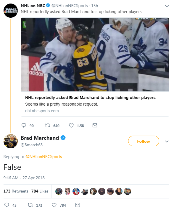 On Thursday night, an NHL spokesman confirmed to ESPN's Greg Wyshynski that the league demanded Marchand not repeat his apparent lick of Toronto Maple Leafs forward Leo Komarov's neck in Game 1 of their first-round playoff series.