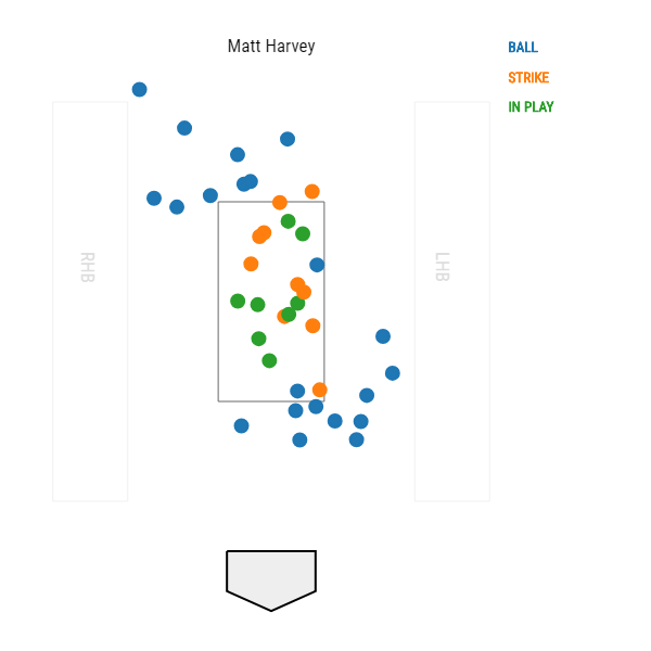 As evidenced by the picture above, Harvey struggled with his control, and when he was in the strike zone, he was hit hard. Meanwhile, his fastball velocity, which some assumed would rise with a move to the bullpen, was 94 mph on the day. As a starter this season, Harvey averaged 93 mph on his fastball.