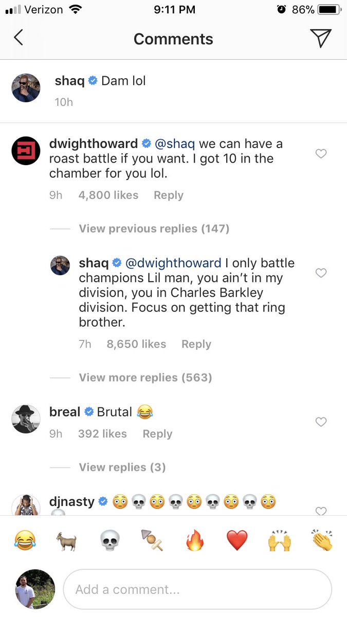 Shaq took notice of the footage circulating on social media and posted it to his Instagram page. Howard responded soon after by challenging the Hall of Famer to a roast battle, but the Big Aristotle isn't interested.