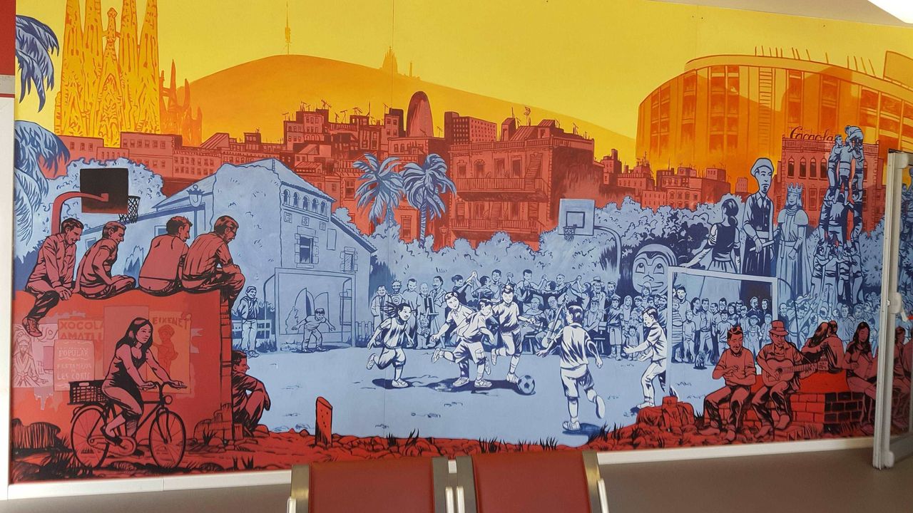 Upon closer inspection, the artwork is a who's who of Barcelona culture: the Camp Nou and Sagrada Familia in the background; the aforementioned farmhouse; young footballers with scouts looking on; Gaudi's Park Guell palm trees. The classic Barca colors, it's all there: