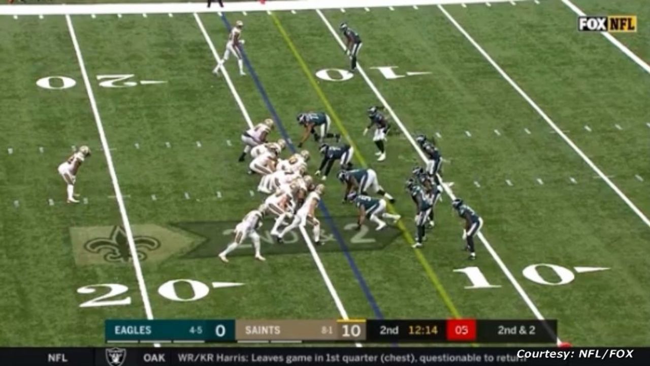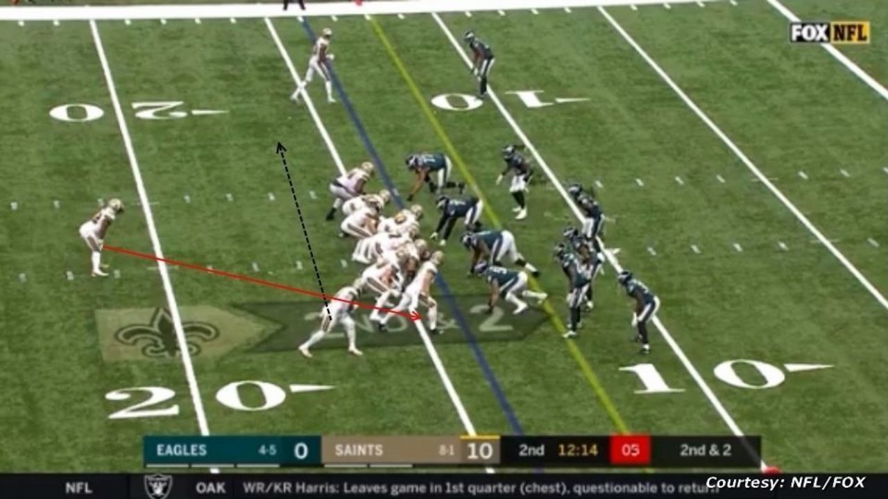 Two players - safety Malcolm Jenkins (No. 27) and cornerback Chandon Sullivan (No. 39) - slide inside in response to Kamara's motion. Drew Brees takes the snap, fakes a quick handoff to Kamara, and then hands the ball to Ingram (No. 22) to test the right edge - the spot that Jenkins and Sullivan left. The Eagles' defense overreacts to the potential end around to Kamara and completely vacates the left side.