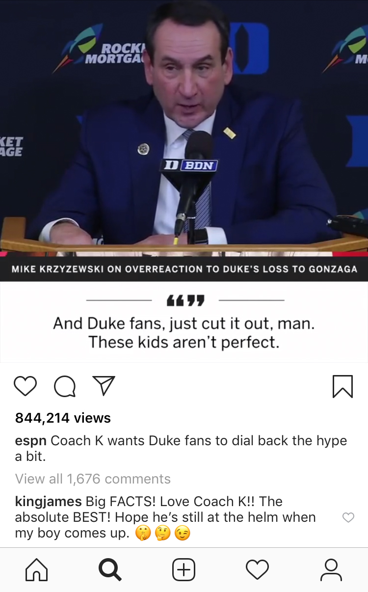 The Los Angeles Lakers star threw his support behind Krzyzewski on Instagram on Wednesday, while also hinting at the possibility his 14-year-old son LeBron "Bronny" James Jr. could play for the Duke head coach one day.
