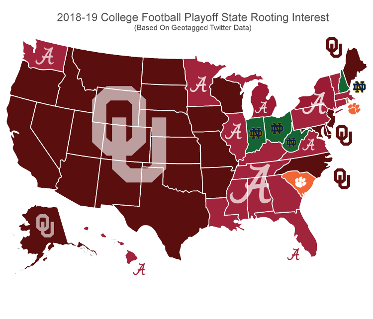 Most of the United States will be cheering on Oklahoma in Saturday's College Football Playoff semifinals, according to a new Twitter map.