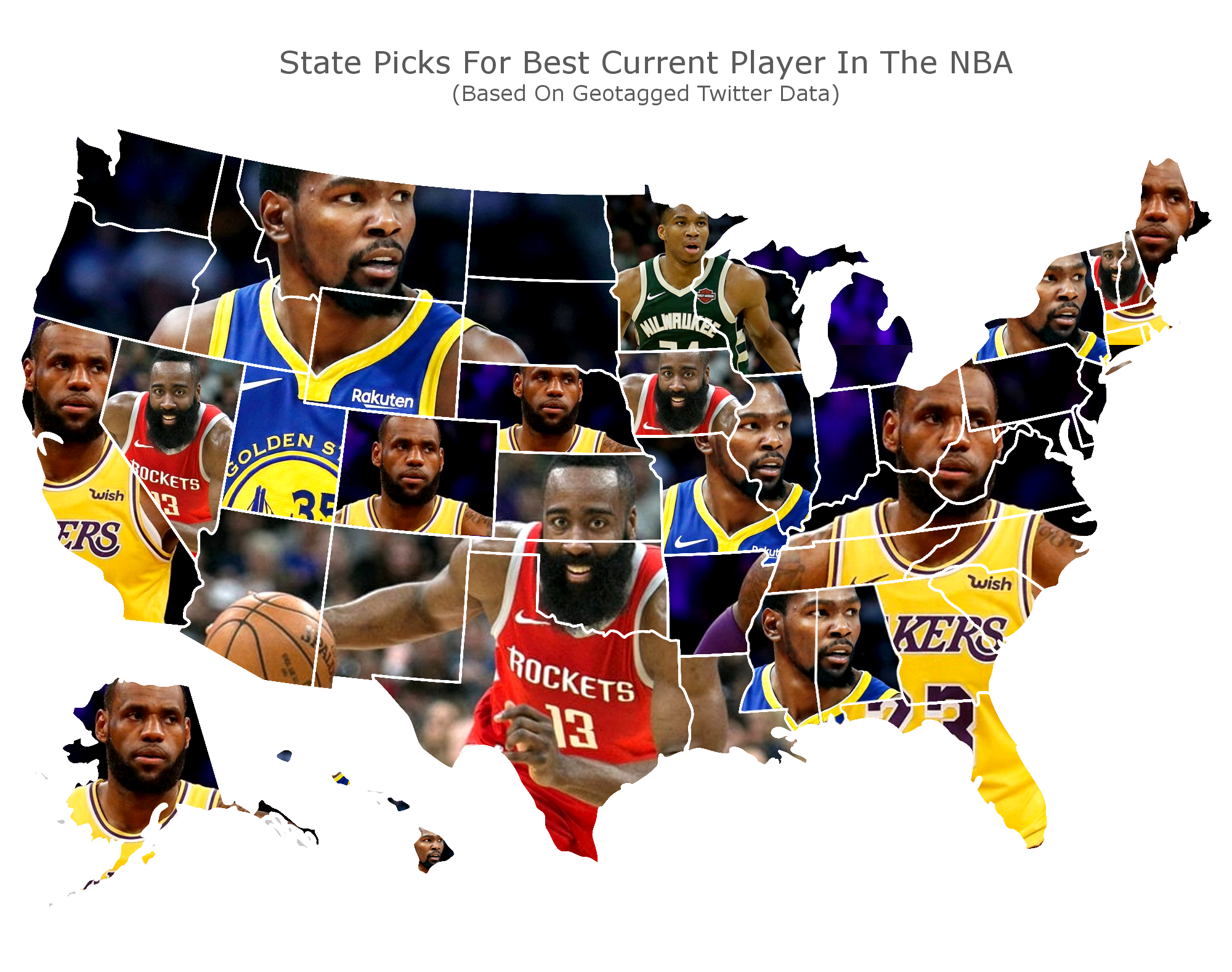 Using geotagged Twitter data from the past two months that tracked discussions about the "best" current players in the NBA, Sportsinsider.com put together a map of the United States depicting who is favored in each state. James won the most states of any player with 24, followed by Kevin Durant with 14, James Harden with 10, and Giannis Antetokounmpo with two.