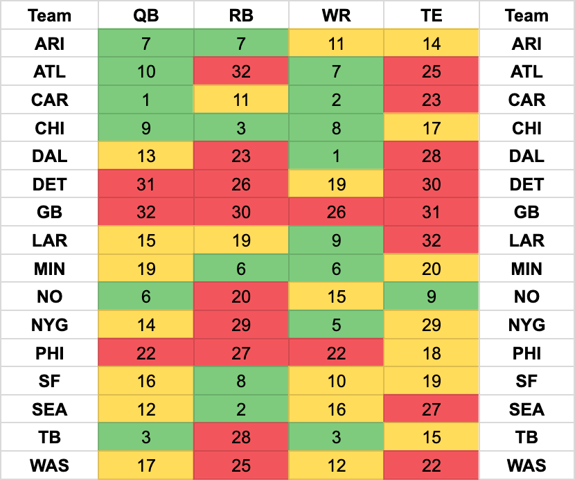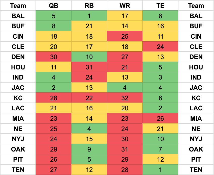 The No. 1 ranked team is forecasted to see the easiest slate, while the No. 32 club will face defenses projected to allow the fewest fantasy points to that position in 2019.