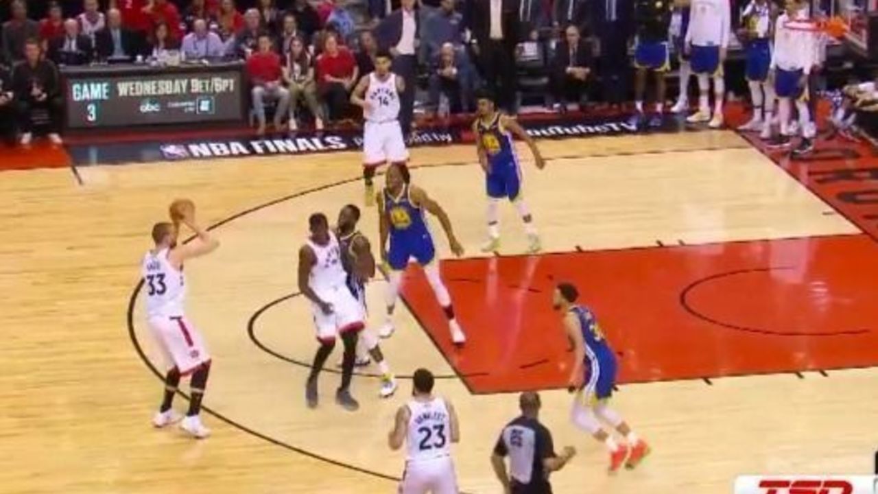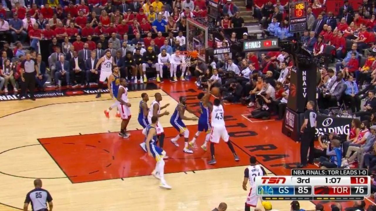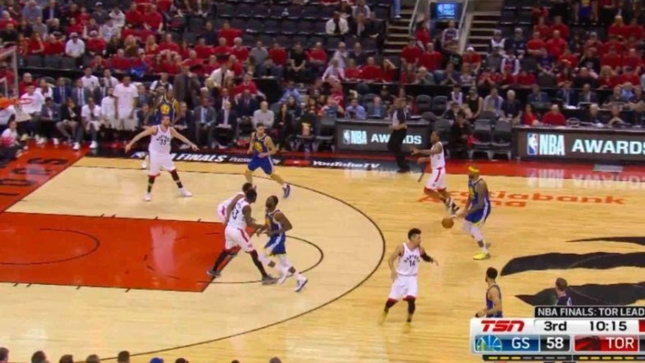 Transition was a particularly big issue, and this possession - during the Warriors' oxygen-sucking 18-0 run to start the third - was illustrative. Leonard jogged back while Thompson sprinted up the floor, which forced Marc Gasol to abandon Iguodala in the corner and slide over to Thompson. Leonard didn't pick up Iguodala in turn (he seemed to be motioning for Kyle Lowry to help), and Iguodala splashed a three with nobody within 20 feet of him.