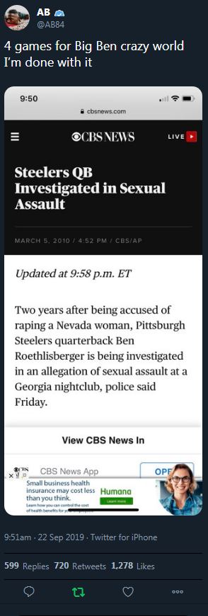 Brown also referenced Pittsburgh Steelers quarterback and former teammate Ben Roethlisberger, who was suspended six games - eventually reduced to four - for violating the NFL's personal conduct policy in 2010.