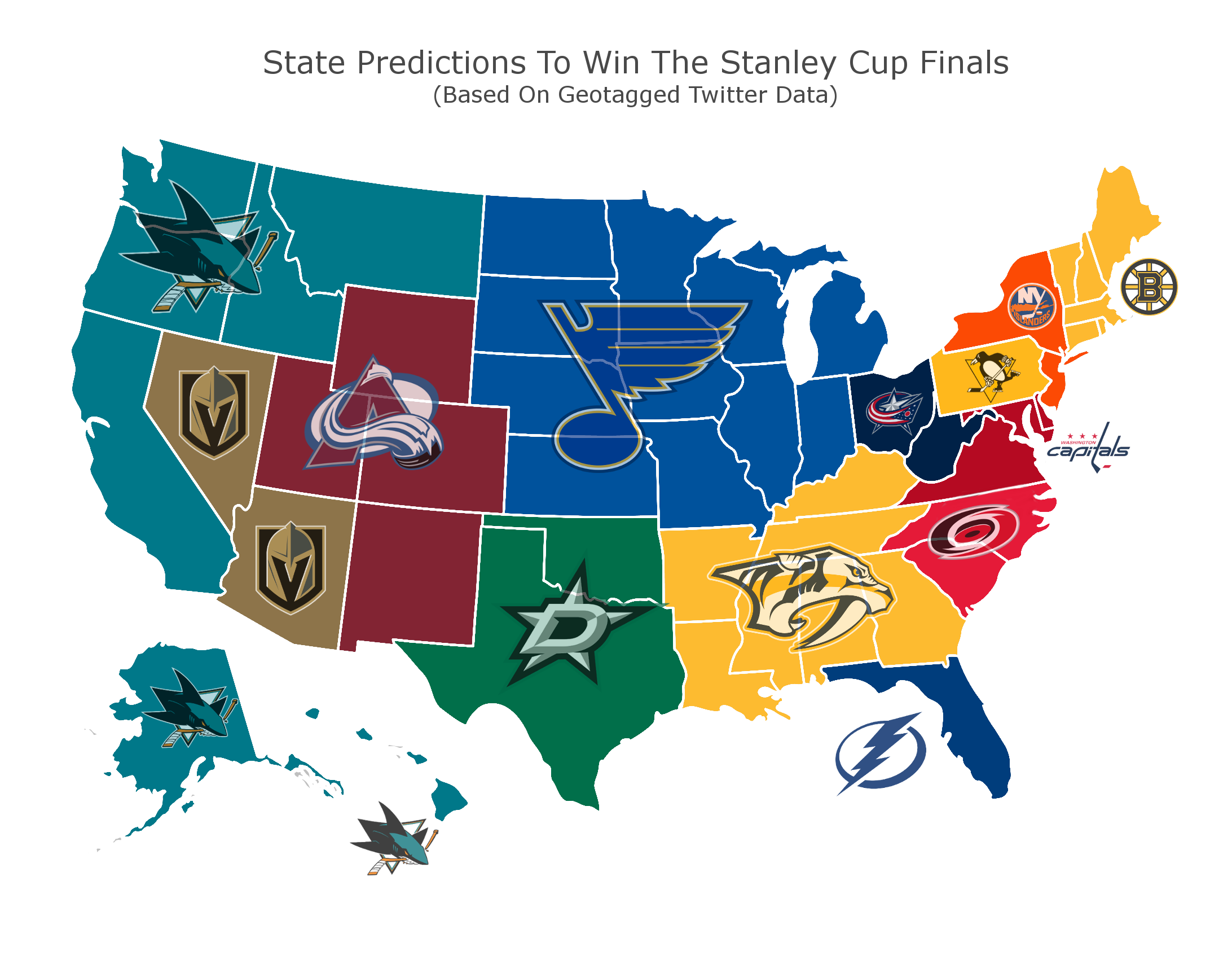 Bettingapps.org put together a map that shows each state's prediction for the 2020 Stanley Cup champion based on geotagged Twitter data gathered since the start of the season, including over 100,000 tweets. The reigning champion St. Louis Blues were the favorites with 11 states picking them to win the Cup, while the Lightning were favored in only one state - Florida.