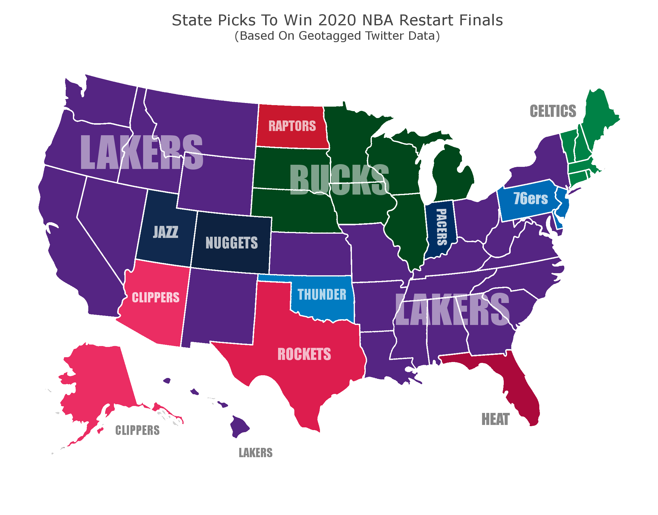 A map created by SportsInsider.com shows the Lakers are the runaway favorites to win the NBA Finals, garnering support in 25 states. The Milwaukee Bucks were the second most popular pick with seven states, while the defending champion Toronto Raptors were only favorited in one state.
