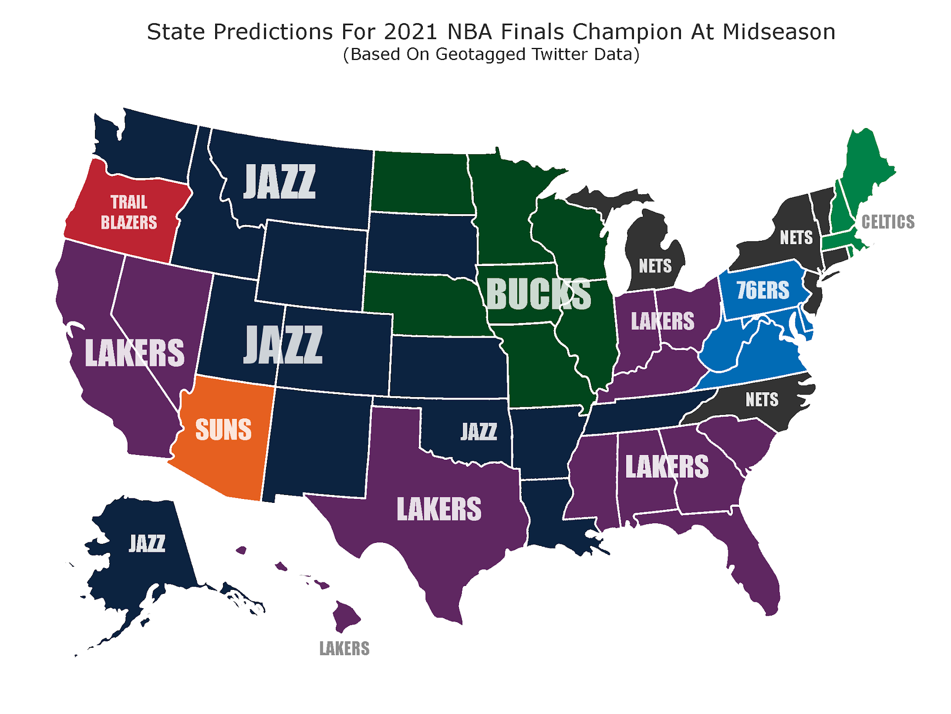 A map created by Sportsbetting.ag using geotagged Twitter data from the last month, including hashtags and keyword phrases related to the 2021 NBA championship, shows the Jazz are the most popular pick to win the title across the U.S.