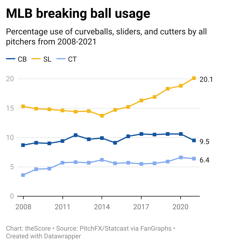 The shape of breaking balls is also changing. They're becoming more distinct. Throughout the majors, curveballs had their greatest vertical movement on average last season, while sliders moved slightly more horizontally and less vertically, according to pitch-tracking data at FanGraphs.com. Pitchers, especially those who throw multiple breaking pitches, want different shapes from those pitches.