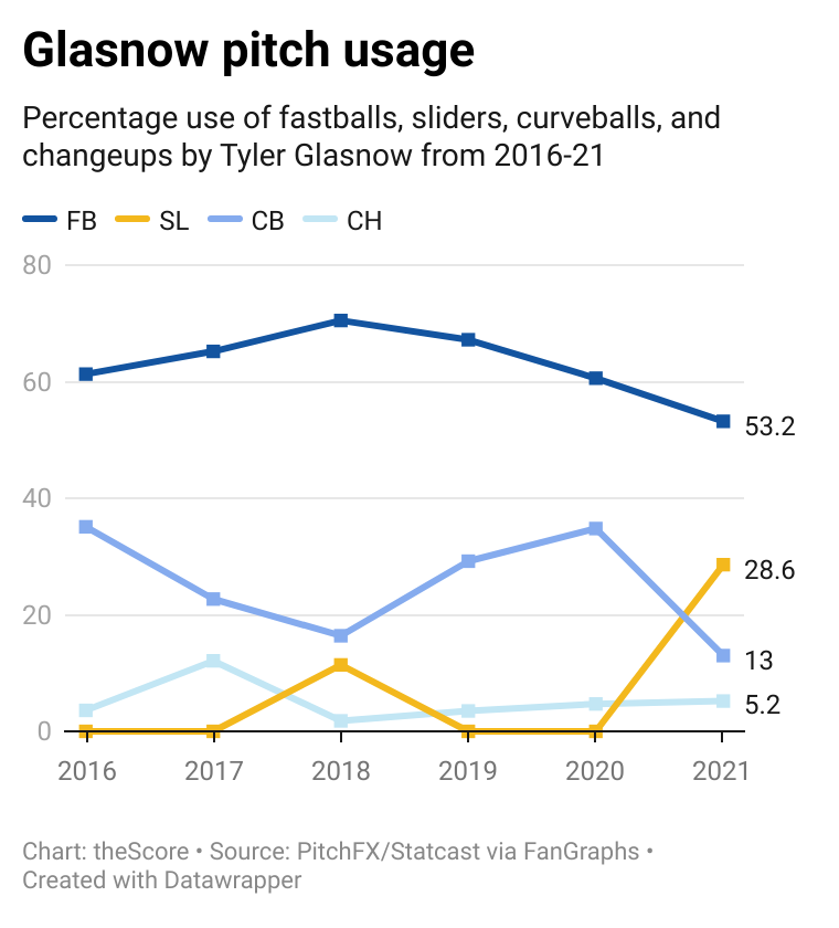 One reason for the increase is that it's typically easier for pitchers to tunnel a slider with a fastball. The two pitches generally share the same release point and travel on the same path for the longest part of their journey to home plate. Some pitchers talk about a curveball "popping" out of their hand, which can be an early giveaway to batters. The slider would also give Glasnow a breaking ball with a different shape than his curveball. It's a pitch that generally can be thrown within the strike zone a bit more often than the curveball.