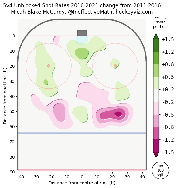 The purple blobs represent decreases in five-on-four shot volume between 2011-16 and 2016-21; the green blobs represent increases. At the blue line, point shots have started to move to the middle and the overall volume favors shots from below the top of the circles.