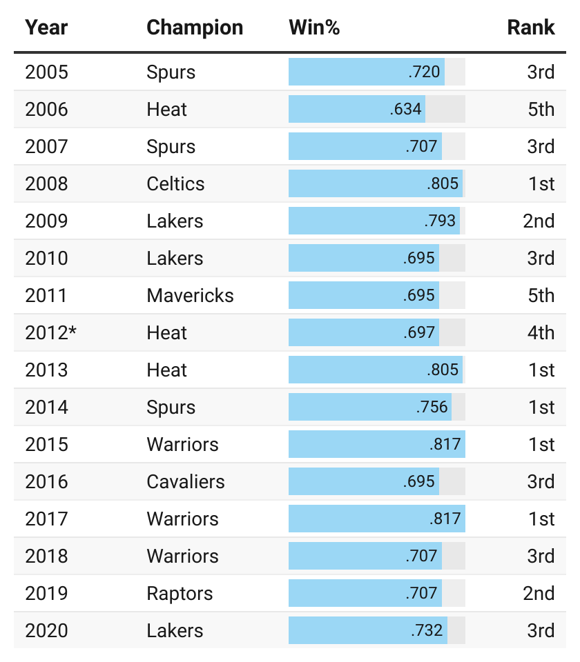 Even that might be a bit conservative, as the winning percentage outlier, the 2005-06 Heat, were on a 55-win pace (41-20) after Pat Riley took over coaching duties from Stan Van Gundy and a 58-win pace (42-17) with Shaquille O'Neal in the lineup after the big man missed 18 of 20 games to start the season. You'll also notice that the last eight champs finished with top-three records.