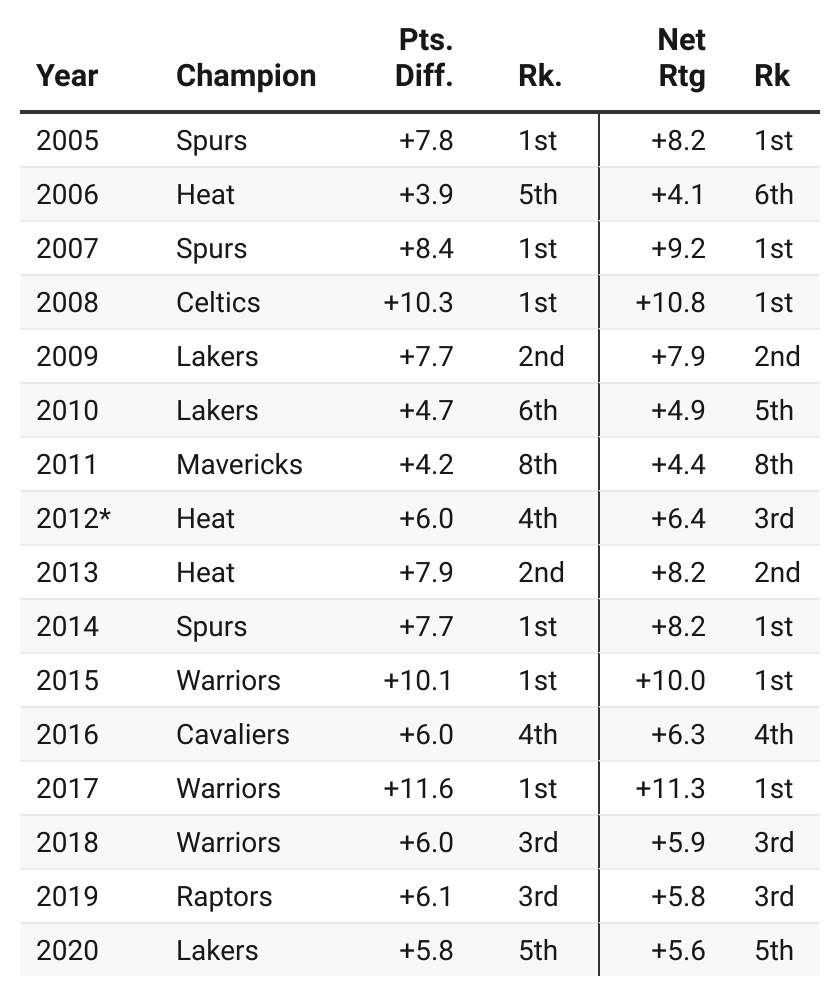 An NBA champion needs to boast a top-eight scoring differential and top-eight net rating per 100 possessions. Specifically, the previous champions have outscored opponents during the regular season by at least 3.9 points per 48 minutes or 4.1 points per 100 possessions. The 2011 Mavs are an obvious outlier here, and a top-five differential might be the more accurate cutoff.