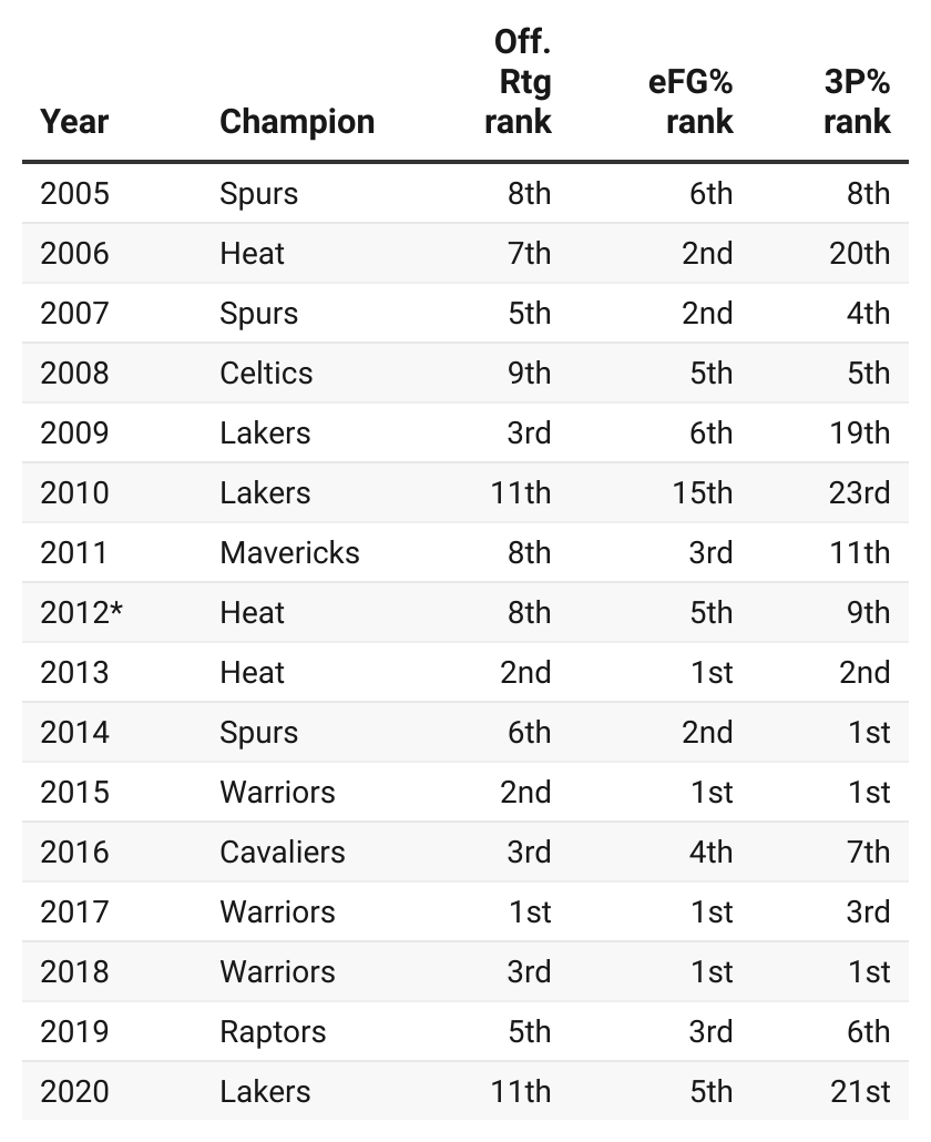 However, in the interest of consistency, we'll include the 2020 and 2010 Lakers and say that the 2021 champion only requires a top-11 offensive rating, a top-15 eFG%, and a top-23 3-point percentage.