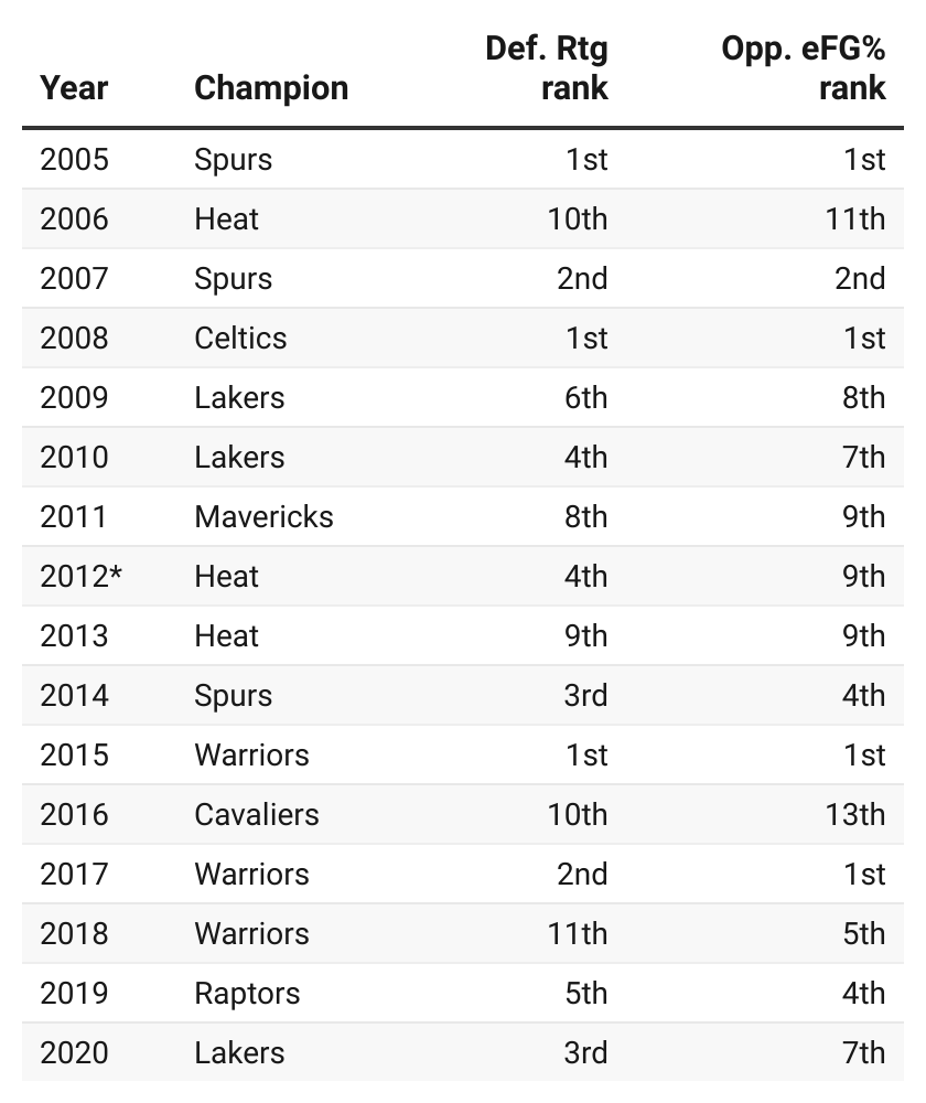 If we do ignore the 2010 and 2020 Lakers, we could use the 14 other modern champions to determine the requirements are a top-nine offense and top-six effective field-goal percentage. That leaves these teams.