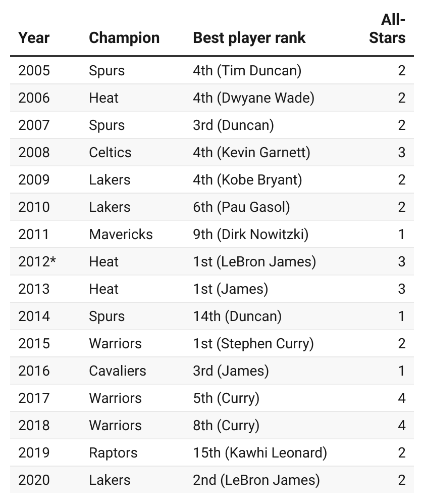 There's obviously no way to quantify with 100% accuracy where players rank individually in the NBA, but one fun tool determines how stars stack up based on their average rank across a plethora of catch-all stats. Andy Bailey made this measure famous on Basketball Twitter. According to that data, each of the last 16 champions has had a player rank in the top 15 during the regular season. When you consider how flawless the 2014 Spurs were, and how much better than the 15th-best player Leonard was in 2019 (when regular season games played held him back in the rankings), you realize that a top-10 player - if not top five - is probably what's truly necessary.