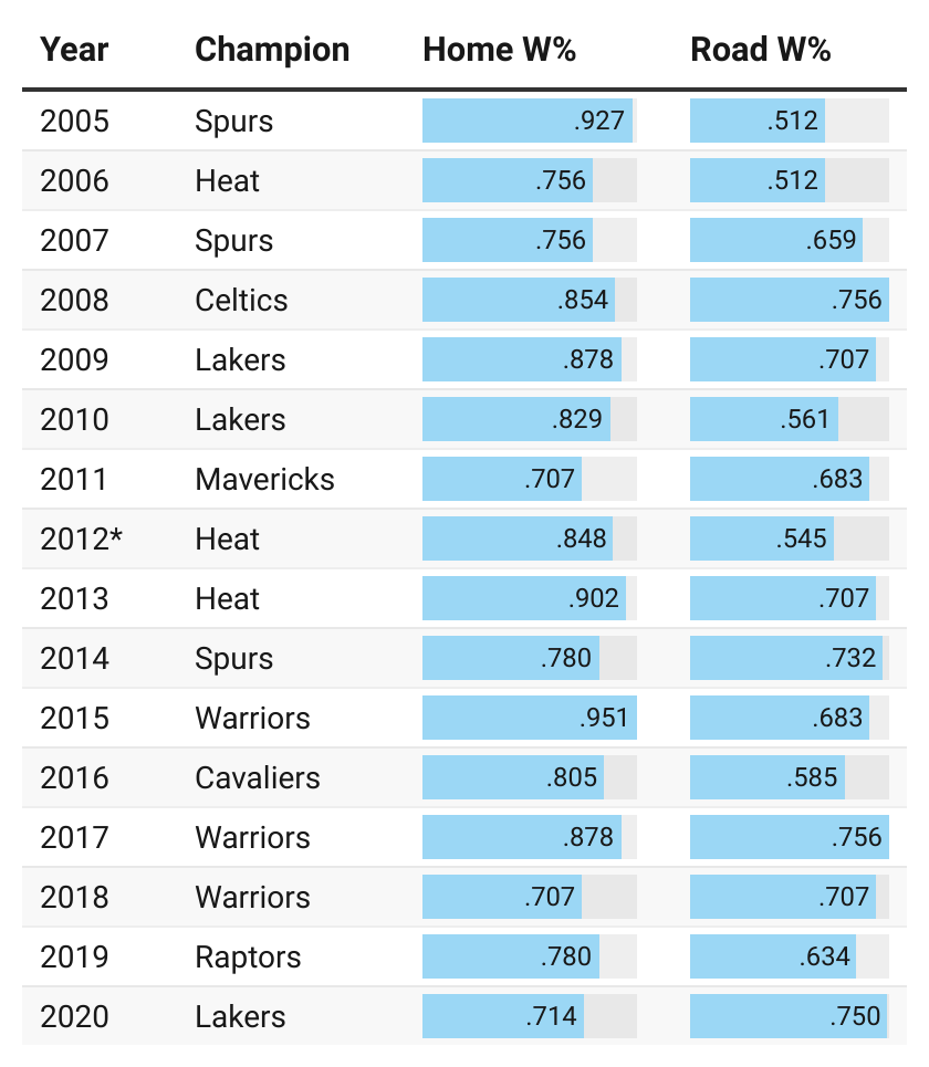 We're looking for teams that dominate at home and, at the very least, still win on the road. Modern champions post a minimum home win percentage of .707 (equivalent to a 29-12 home record in a full season) while also recording a winning record on the road.