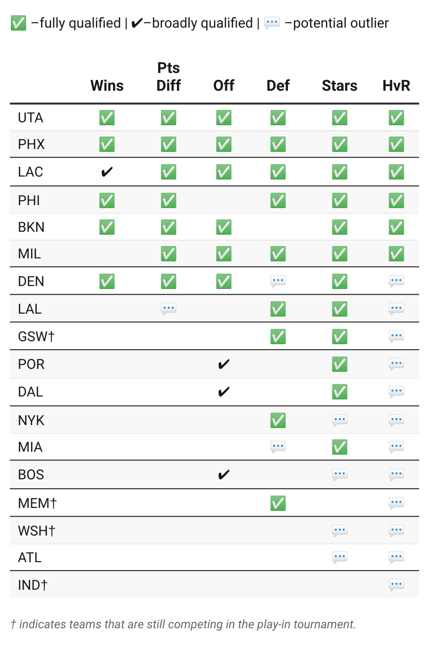 Only two teams managed to check every box, with the Jazz and Suns entering the playoffs as the clear-cut favorites when considering the statistical profiles of modern NBA champions (though neither team is a betting favorite).